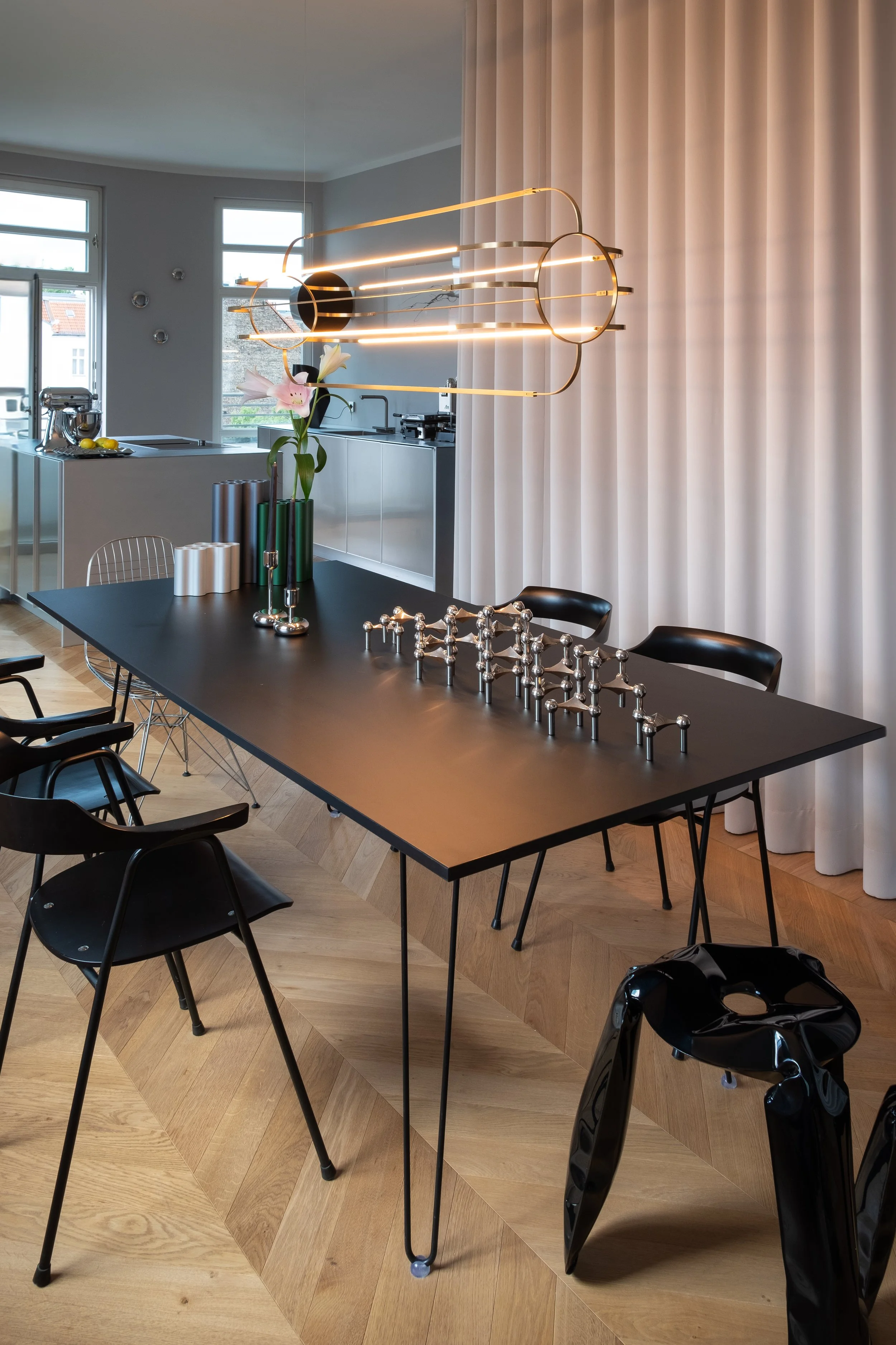 The proportions of the luminaire have been designed to fit large tables. We took great care about its light distribution, the two upper LED sources emit the light directly upwards, the other two illuminate the table surface generously. Charlotte fills the space with a highly pleasant, non-blinding light.